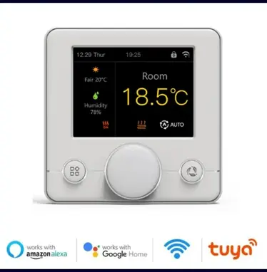 Терморегулятор (термостат) з WiFi-керуванням BYL-158EW Має функцію вимірювання вологості в приміщенні, індикацію погоди, температури та вологості на вулиці. Терморегулятор може керувати як котлом, так і електричними теплими підлогами, а також актуаторами на гребінці водяної теплої підлоги. Працює з мобільним додатком Tuya.